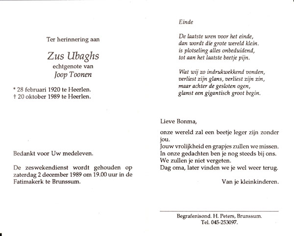 Algemene notities: Het bidprentje. Maria trouwde met Joop Toonen. (Joop Toonen werd geboren op 16 Apr 1917 in Heerlen, Limburg, Nederland en overleed op 4 Jan 1997 in Brunssum, Limburg, Nederland.) |
